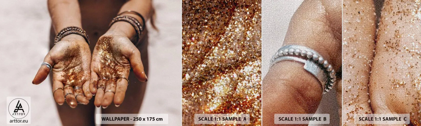 Fototapeta Próbka Premium Canvas - Dar dla ciebie - Kobiece Dłonie, Boho, Złoto - 100x30 cm