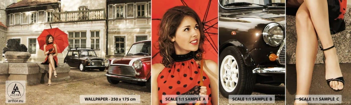 Fototapeta Próbka Samoprzylepna Deluxe Sticker - Minipodróż sentymentalna - Kobieta, Architektura, Samochód - 100x30 cm