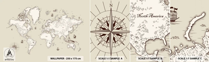 Fototapeta Próbka Samoprzylepna Deluxe Sticker - Podróż dookoła świata - Mapa Świata, Kontynenty, Statek Piracki - 100x30 cm