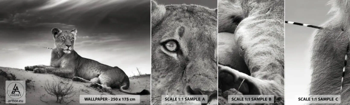 Fototapeta Próbka Samoprzylepna Deluxe Sticker - Odpoczynek królowej pustyni - Zwierzęta, Lew, Pustynia - 100x30 cm