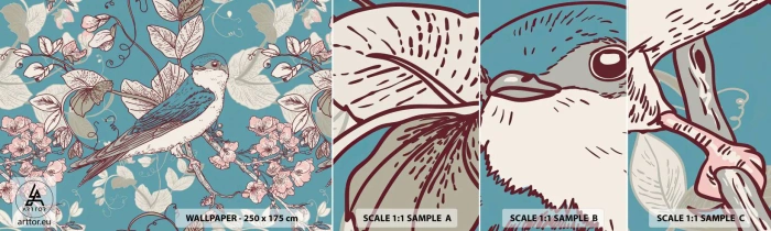 Fototapeta Próbka Samoprzylepna Deluxe Sticker - W białodrzewiu ćwirnie i srebliście - Abstrakcja, Jaskółka, Ptak - 100x30 cm