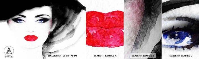 Fototapeta Próbka Samoprzylepna Deluxe Sticker - Odpycha i przyzywa - Twarz Kobiety, Czerwone Usta, Niebieskie Oczy - 100x30 cm