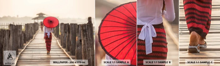 Fototapeta Próbka Samoprzylepna Deluxe Sticker - Na starym moście - Parasol, Birma, Drewniany Pomost - 100x30 cm