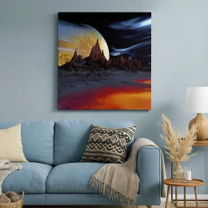 Obraz na płótnie - Fantastyczny krajobraz z planetami i wulkaniczną scenerią - 100x70cm - Nieznany świat - Nowoczesna dekoracja ścienna do salonu, kuchni i sypialni ARTTOR