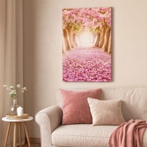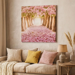 - Romantyczna aleja pełna kwitnących drzew w pastelowych odcieniach różu. Idealny obraz na ścianę do wprowadzenia spokoju i uroku do wnętrza.