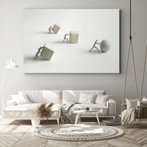 - Obraz ukazujący miniaturowe postacie pchające geometryczne kształty na jasnym tle. Wyrazista symbolika pracy i determinacji idealnie pasuje do nowoczesnych wnętrz.
