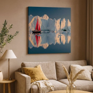 - Obraz przedstawia żaglówkę z czerwonym żaglem na tle imponującego lodowca, odbijającą się w spokojnej tafli wody. Niesamowity krajobraz o harmonijnej estetyce, który wnosi do wnętrz spokój i piękno przyrody.