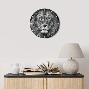 - Zegar ścienny z czarno-białym portretem majestatycznego lwa. Realistyczne detale i głębia spojrzenia drapieżnika nadają obrazowi siłę i elegancję.