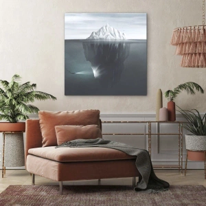 - Obraz przedstawiający górę lodową w wodzie z nurkiem i reflektorem pod powierzchnią. Subtelna i klimatyczna kompozycja wprowadza harmonię i refleksję do każdego wnętrza. Idealny wybór dla miłośników nowoczesnej sztuki i przyrody.