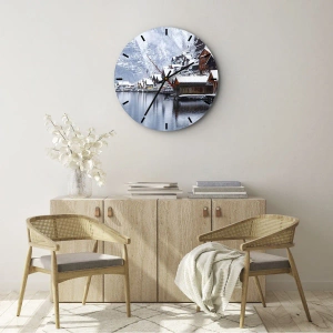 - Zegar z zimowym krajobrazem przedstawiającym domki nad górskim jeziorem otulone śniegiem to dekoracja pełna spokoju i uroku. Doskonale nadaje się do wnętrz inspirowanych naturą i spokojem.