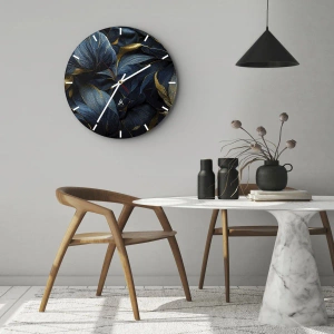 • Zegar ukazuje elegancką kompozycję ciemnych kwiatów zdobionych złotymi liniami. Wyważone połączenie głębokich tonów z błyskiem złota tworzy wytworny akcent dekoracyjny o subtelnej, luksusowej estetyce.