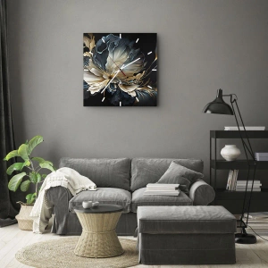 Zegar ścienny ""Baśniowy kwiat paproci"" to wyjątkowe dzieło dekoracyjne, które przyciąga wzrok swoją niezwykłą florystyczną kompozycją. Na szklanym cyferblacie rozwija się fantazyjny kwiat w odcieniach złota, granatu i kremu, otoczony subtelnymi akcentami świetlistych drobinek. Obraz zachwyca płynnością form i zmysłowym ruchem płatków, tworząc wizję jak z baśni.