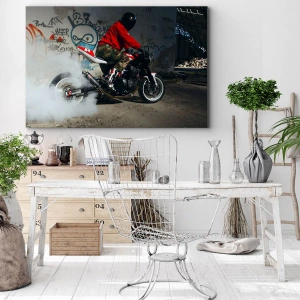Obraz to także doskonały pomysł na prezent dla fanów motocykli, sportów ekstremalnych i miejskiego stylu. Może być głównym punktem aranżacji lub wyjątkowym dodatkiem podkreślającym indywidualizm wnętrza.