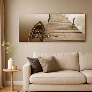 - Malowniczy obraz przedstawiający drewniane molo i łódź na spokojnym jeziorze w odcieniach sepia. Idealny do wnętrz, które cenią harmonię i refleksję.