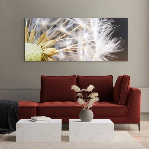 Zbliżenie na dmuchawiec z delikatnymi nasionami unoszącymi się w powietrzu tworzy minimalistyczną kompozycję, która wprowadza spokój i harmonię do wnętrza. Obraz wykonany na szkle o wymiarach 70x50cm wyróżnia się elegancją i trwałością.