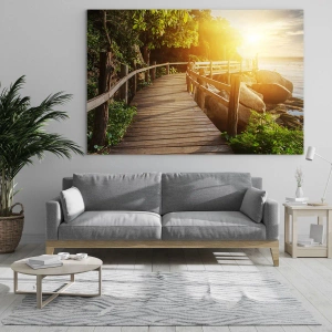 Obraz na szkle - Drewniana ścieżka wśród drzew nad brzegiem morza w świetle zachodu słońca - 70x50cm - Kolejny zakręt, kolejne cuda - Nowoczesna dekoracja ścienna do salonu i sypialni ARTTOR