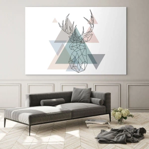 Obraz na szkle - Geometryczny rysunek jelenia na tle pastelowych trójkątów - 70x50cm - W geometrycznym lesie - Nowoczesna dekoracja ścienna do salonu i sypialni ARTTOR