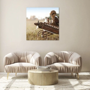 - Obraz przedstawia dziecko w drewnianym samolocie, udające pilota, w klasycznym ubraniu lotniczym. Inspirująca scena z dzieciństwa, która symbolizuje marzenia. Produkt wykonany na szkle.
