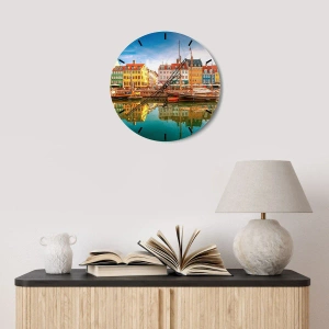- Kolorowe kamienice z odbiciami w wodzie i łodziami w porcie miejskim. Idealny zegar do wnętrz o miejskiej lub skandynawskiej tematyce.