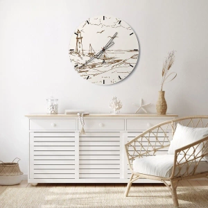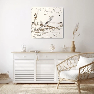 Zegar ścienny - Zarys wspomnienia lata - Ilustracja latarni morskiej z żaglówką i ptakami na tle nieba