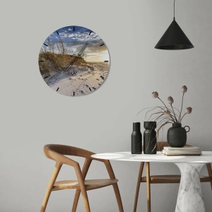 - Artystyczny zegar ścienny 30x30 cm z widokiem na piaszczystą plażę z trawami przy zachodzie słońca. Wykonany na szkle w formacie okrągłym. Idealny do wnętrz w stylu morskim, naturalnym i relaksacyjnym.
