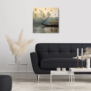 Scena oddaje prostotę i piękno życia nad wodą, gdzie rytm natury wyznacza codzienność. Tropikalne palmy i łagodna tafla wody wprowadzają do wnętrza spokój, egzotyczną atmosferę oraz uczucie oderwania od codziennych trosk, kierując myśli ku podróżom i beztrosce.