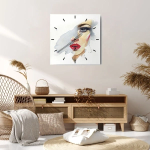 "Odbicie w kropli wody" to artystyczny Zegar ścienny przedstawiający zmysłowy Portret Kobieta w technice Akwarela. Na jasnym tle wyraźnie zarysowane zostały delikatne rysy twarzy, wyraziste spojrzenie oraz intensywnie czerwone usta, które przyciągają wzrok i nadają całości niezwykłego wyrazu. Kompozycja utrzymana jest w stylistyce nowoczesnej, łączącej minimalizm z artystyczną ekspresją.