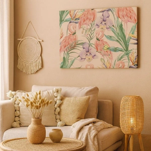 Obraz na płótnie - Egzotyczne flamingi i tropikalne kwiaty - 50x70cm - Różowy balet w kwiatach - Nowoczesna dekoracja ścienna do salonu, kuchni i sypialni ARTTOR