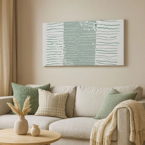 - Obraz na płótnie przedstawiający geometryczny wzór w odcieniach morskiej zieleni i bieli. Idealny wybór do wnętrz ceniących minimalizm i harmonię.