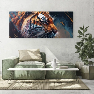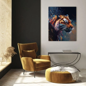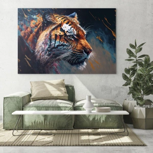 - Obraz ukazuje portret tygrysa uchwyconego w dynamicznej eksplozji kolorów, łączącej naturalne piękno z artystyczną ekspresją. To połączenie dzikości, siły i sztuki w jednym ujęciu.