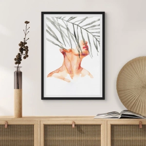 Plakat w czarnej ramie - Akwarelowa kobieta z liśćmi palmy zasłaniającymi twarz - 50x70cm - Poczuć puls tropików - Nowoczesna dekoracja ścienna do salonu i sypialni ARTTOR