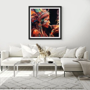 - Plakat przedstawia wyrazisty portret kobiety w barwnym, tradycyjnym pióropuszu. Bogata kolorystyka i pełne detali elementy zdobiące podkreślają mistyczny i symboliczny charakter obrazu, idealny do wnętrz inspirowanych sztuką i kulturą.