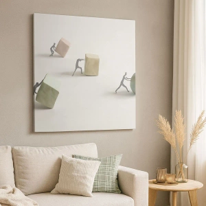 - Obraz ukazujący miniaturowe postacie pchające geometryczne kształty na jasnym tle. Wyrazista symbolika pracy i determinacji idealnie pasuje do nowoczesnych wnętrz.