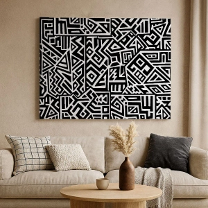 Obraz na płótnie "Kompozycja prekolumbijska" to niezwykła dekoracja, która łączy geometryczne wzory z inspiracją kulturą prekolumbijską. Czarno-biała paleta barw, pełna kontrastów i symetrii, nadaje kompozycji nowoczesnego charakteru, a jednocześnie odwołuje się do bogatej historii i tradycji.