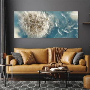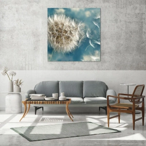Obraz na szkle - Zdmuchiwany dmuchawiec na tle niebieskiego nieba - 80x120cm - Oddech anioła - Nowoczesna dekoracja ścienna do salonu i sypialni ARTTOR