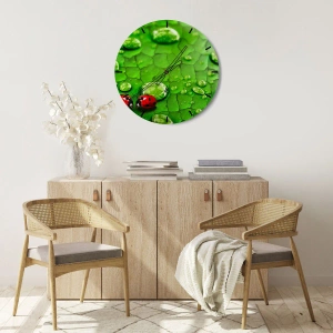 Zegar ścienny - Spotkanie w zieleni - Biedronki na liściu z kroplami wody