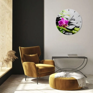 Zegar ścienny - Fioletowa orchidea, czarne kamienie i bambus w spokojnej kompozycji - 30x30cm - W spokojnej równowadze - Nowoczesna dekoracja ścienna do salonu i sypialni ARTTOR