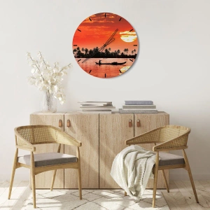 Zegar ścienny - Tropikalny zachód słońca z łodzią na tle palm - 30x30cm - Spokój tropików o zachodzie - Nowoczesna dekoracja ścienna do salonu i sypialni ARTTOR