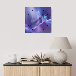 - Zegar ścienny 'Klejnot natury' z wizerunkiem motyla na tle subtelnych fioletów i błękitów. Idealny do wnętrz pełnych elegancji i spokoju.