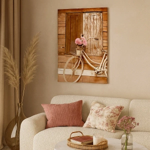Obraz na płótnie - Retro rower z koszem pełnym kwiatów przy drewnianej ścianie - 50x70cm - Zaraz wracam - Nowoczesna dekoracja ścienna do salonu, kuchni i sypialni ARTTOR