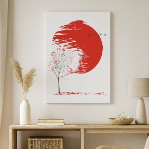 Obraz na płótnie - Czerwone słońce, drzewo z czerwonymi liśćmi i lecące ptaki - 50x70cm - Znasz li ten kraj? - Nowoczesna dekoracja ścienna do salonu, kuchni i sypialni ARTTOR