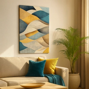 - Obraz przedstawia abstrakcyjne fale w odcieniach niebieskiego i złota. Kompozycja doskonale wpisuje się w nowoczesne i eleganckie wnętrza.