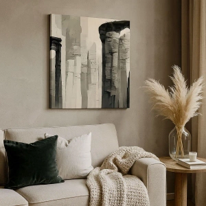 Kompozycja obrazu ukazuje majestatyczne kolumny, które symbolizują siłę, stabilność i ponadczasowość. Odcienie szarości i czerni podkreślają teksturę kamienia, nadając obrazowi głębi i wyrafinowania. Subtelne światło i cienie tworzą harmonijną atmosferę, która wprowadza spokój do każdego wnętrza.