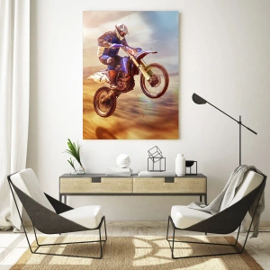 Obraz na szkle - Motocyklista w locie nad piaszczystym terenem - 50x70cm - Motocyklowy zawrót głowy - Nowoczesna dekoracja ścienna do salonu, kuchni i sypialni ARTTOR