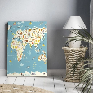 - Obraz przedstawiający kolorową mapę świata z ilustracjami zwierząt, łączący edukacyjny charakter i artystyczny wyraz. Idealny do dziecięcych wnętrz.