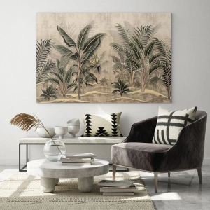 Obraz zachwyca subtelnością wykonania i dbałością o detale. Poszczególne elementy roślinne tworzą gęstą, lecz harmonijną kompozycję, która przyciąga wzrok swoją strukturą i głębią. Liście palmowe oraz inne egzotyczne formy roślinne przeplatają się ze sobą, tworząc niemal realistyczną scenę, pełną spokoju i tropikalnego uroku.