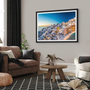 Plakat w czarnej ramie - Widok na greckie miasteczko o zachodzie słońca - 70x50cm - Esencja greckości - Nowoczesna dekoracja ścienna do salonu i sypialni ARTTOR