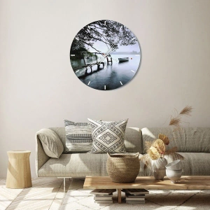 Zegar ścienny - Pomost nad wodą z łodzią w tle otoczoną mglistym krajobrazem - 30x30cm - Już odpoczywasz - Nowoczesna dekoracja ścienna do salonu i sypialni ARTTOR