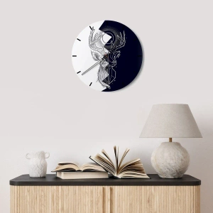 - Zegar z geometrycznym motywem jelenia na tle kontrastujących kolorów. Nowoczesny design i minimalistyczna elegancja idealnie pasują do stylowych wnętrz.