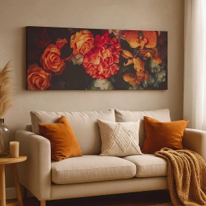 Obraz na płótnie - Bukiet kolorowych kwiatów na ciemnym tle - 50x70cm - Jak u holenderskich mistrzów - Nowoczesna dekoracja ścienna do salonu, kuchni i sypialni ARTTOR